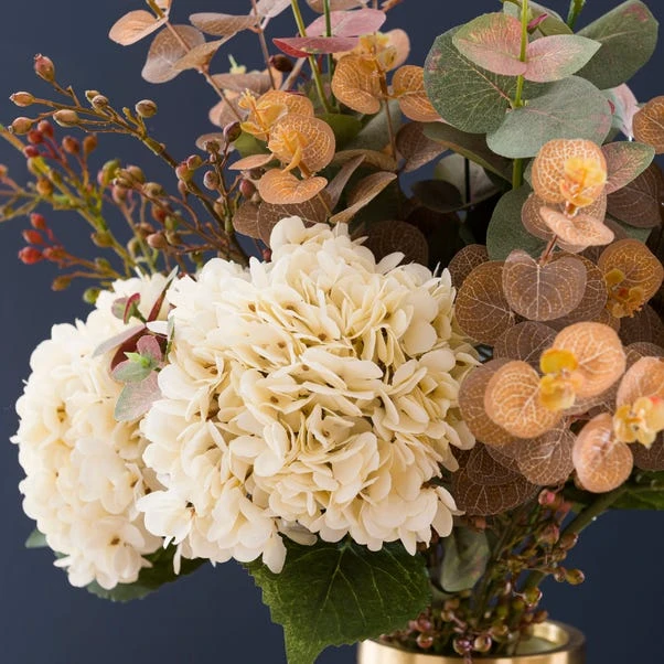 This artificial hydrangea bouquet features full cream blooms and contrasting foliage. Perfect to display in a vase, this bouquet is pre-arranged and needs no maintenance – just wipe clean with a soft cloth for long lasting beauty.