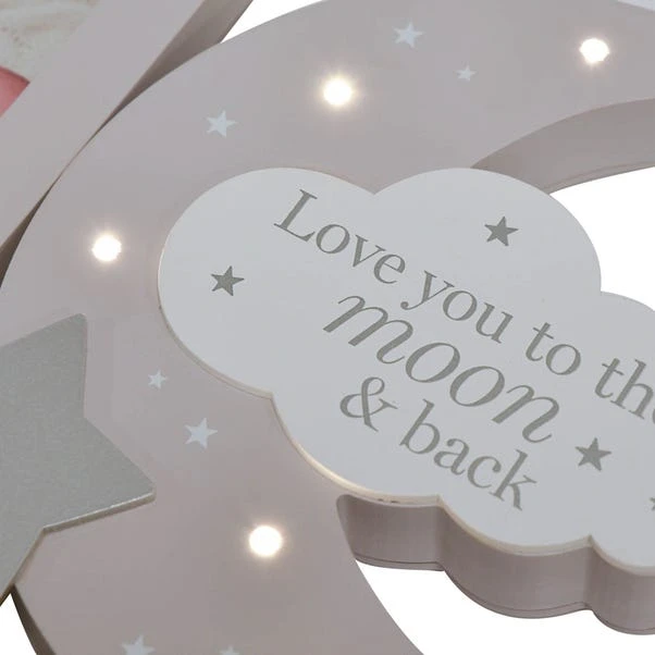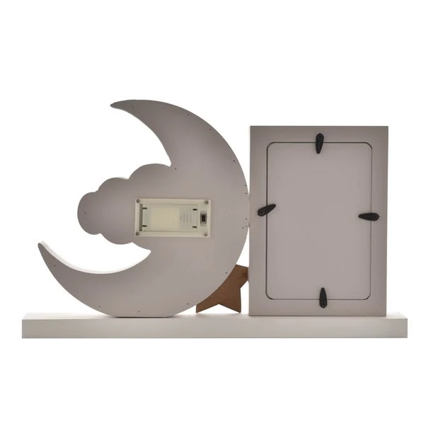 This wonderfully unique frame is an inspiring way to present beloved photos of newborn babies, brightening up their nursery. The grey, freestanding wooden mantel plaque features a single portrait frame; next to the frame sits a complementary light-up crescent moon, complete with a silver star and matching moon, delightfully adorned with “Love You to the Moon and Back” decal.