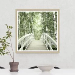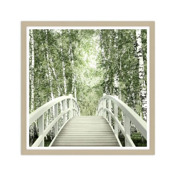 This photographic forest artwork by Oscar David features silver birch trees and an attractive arched bridge and has a lightly textured finish. The printed white border makes the image pop against the champagne-coloured frame which is ready to hang using D ring fixings.