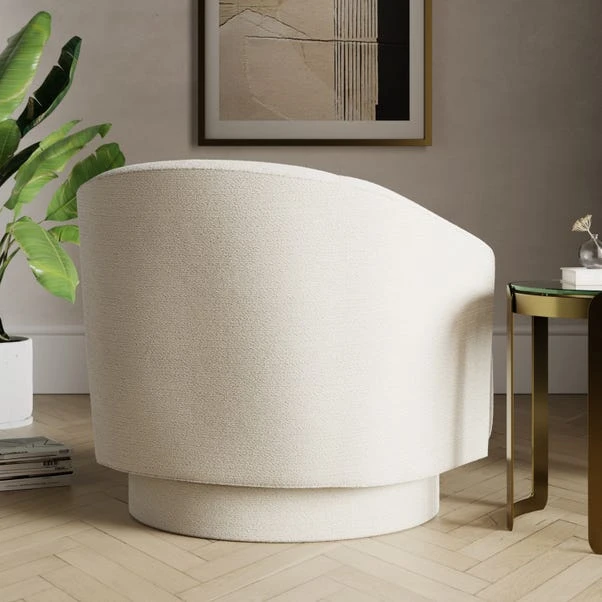 This swivel chair is a contemporary blend of comfort and style for your living space. The soft-touch fabric ensures a comfortable seating experience, inviting you to relax and unwind in style. Its modern and smart design effortlessly complements various interior aesthetics, making it a versatile and sophisticated addition to any room. The chunky chenille upholstery exudes an air of elegance, adding a touch of refinement to your home decor. Designed with a curved silhouette and a convenient swivel feature, the Carmen Chair combines both comfort and functionality, providing an inviting and cosy spot for relaxation.