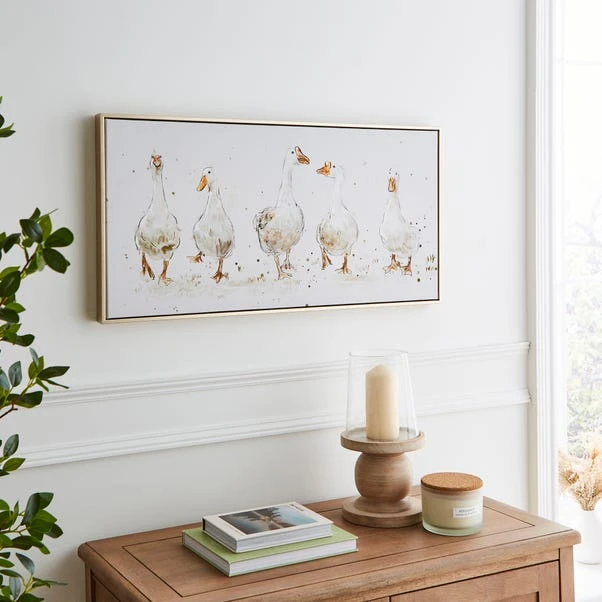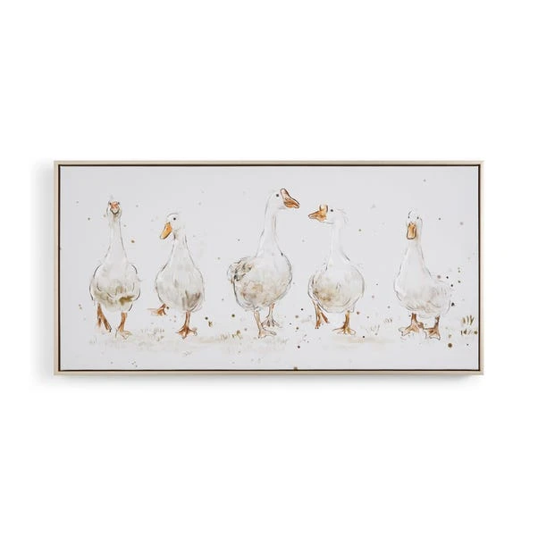 A sweet and charming design, this print depicts a group of happy walking ducks. Perfect for adding that flair of beauty to your home, this canvas is encased in a gold-effect frame.