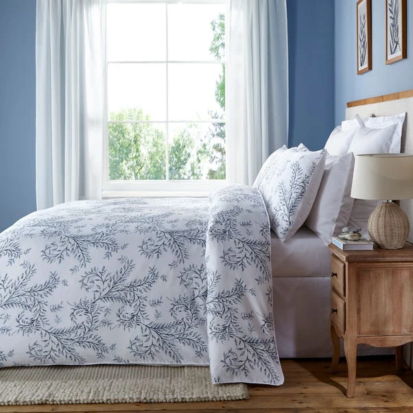 Welcoming our stunning Sea Vine 100% Cotton Duvet Cover & Pillowcase Set, which features a white background with a navy and soft-blue hand-painted leaf designed. Crafted from our classic 300 thread count cotton, it also layers up beautifully with our Eventide collection to create a pretty and relaxing French country cottage style.