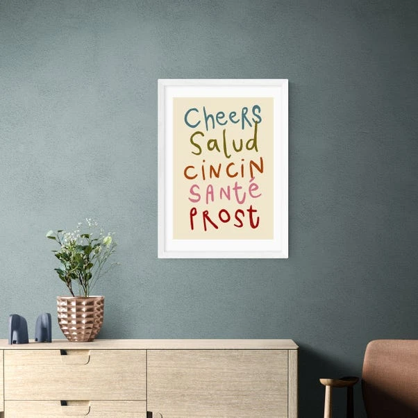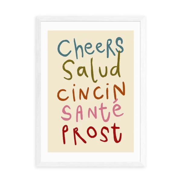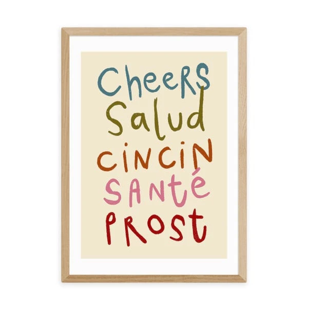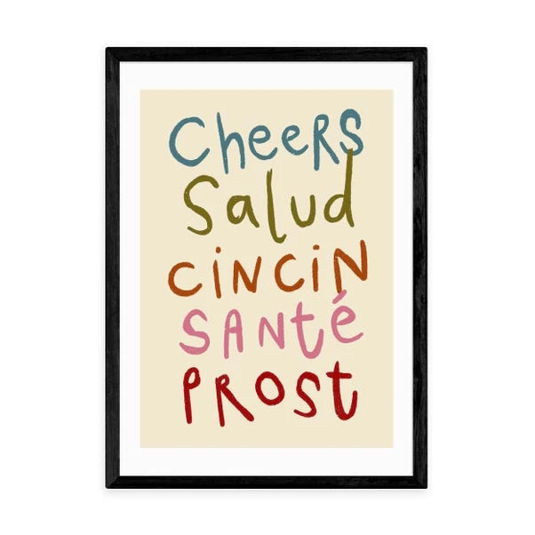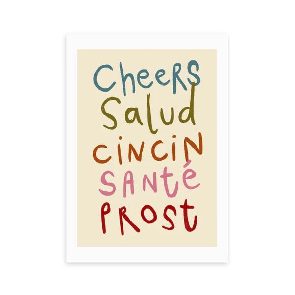 Raise a toast to good times with this cheerful Cheers print by SimplyExtraJordanary, a colourful and lively addition to your entertaining space. With its vibrant, multi-coloured lettering and casual handwriting style, this print brings a lively and celebratory atmosphere to any entertaining space.