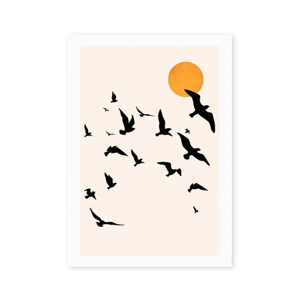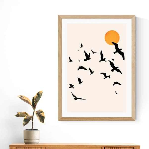 This serene print features silhouetted birds over a warm sunset – perfect for a modern Scandi design style. It’s beautifully printed on archival paper for fade-resistant enjoyment, and comes in a range of sizes and solid Obeche wood frame options, or unframed for your own choice of frame or display style.