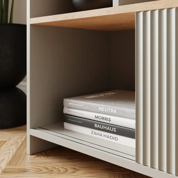 This tall bookshelf unit combines form with function, offering ample space to store books, decorative pieces, and more. The four offset shelf design provides ideal open spaces for displaying your favourite items, while the wide cupboard at the bottom with convenient sliding doors allows for storing other items, keeping your space clutter-free and organized.