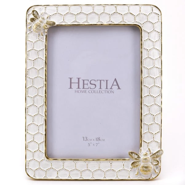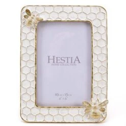 This charming Hestia Honey Bee Photo Frame features 3D bees and an intricate honeycomb design. The cream colour and curved details with gold accents are perfectly stylish for a contemporary home. Designed for either orientation, it includes a sturdy stand for easy display on any surface. This photo frame is available in multiple sizes to suit your photos and would make a great gift idea for Bee lovers!