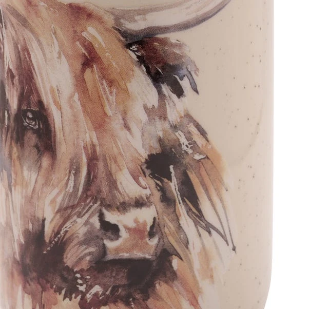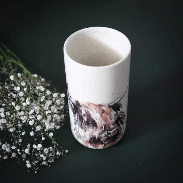 This delightful and unique vase makes a desirable addition to both traditional and modern homes. This piece showcases white, speckled ceramic, complete with gloss finish and a beautiful highland cow image from Meg Hawkins. Its wide opening provides ample space in which to present beautiful flower displays.