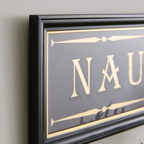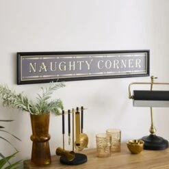 This eye-catching glass wall art features a light-hearted ‘Naughty Corner’ typography design in bold black and gold colouring. The frame is a classic black design with gold detailing and is ready to hang – a fantastic way to lend a vintage, classic feel to your space.