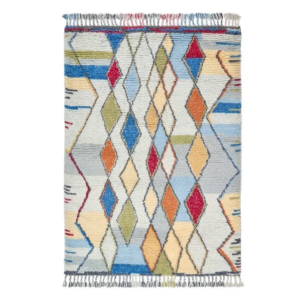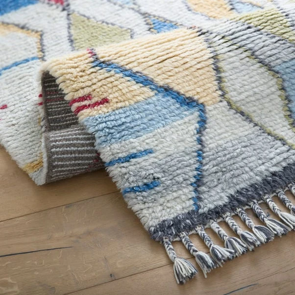 Elevate your living space with the exquisite Navi Premium Hand Knotted Shaggy Wool Rug. This expertly hand knotted rug blends vibrant hues with striking geometric patterns, offering unparalleled comfort with its soft shaggy pile. Each rug is meticulously handcrafted using traditional techniques, ensuring that every piece is a unique work of art. Crafted from the finest durable wool, the rug features a luxurious, chunky shaggy weave and finished with an elegant hand-knotted tassel trim, adding a touch of refined character to your home.