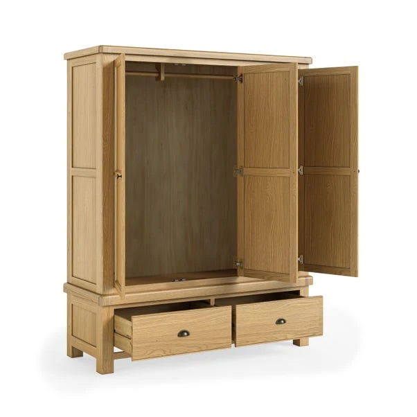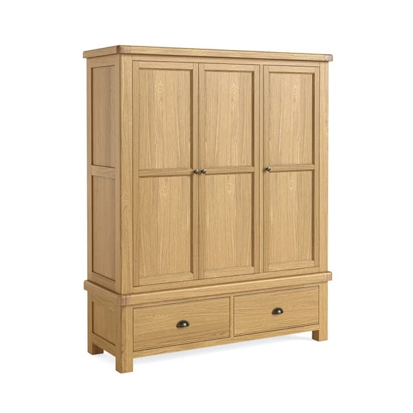 This wardrobe features a classic oak frame that adds timeless elegance, blending seamlessly with both traditional and modern decor. This wardrobe offers ample storage space with its three doors, providing plenty of room for your clothing, accessories, and essentials. Inside, you’ll find multiple hanging rails, allowing for easy organisation.