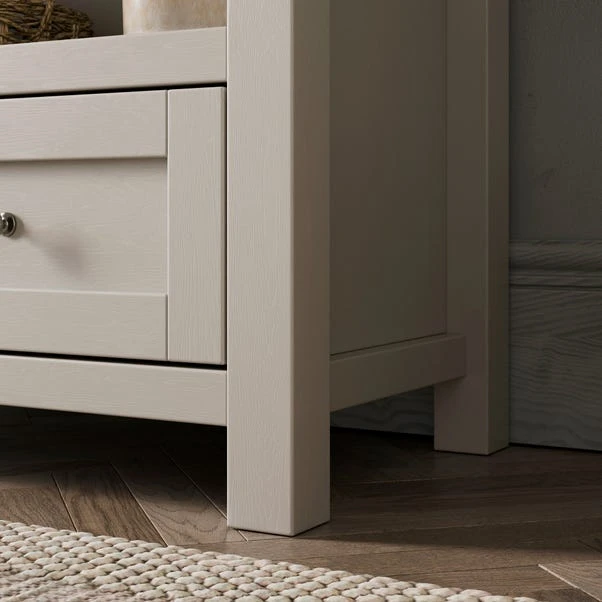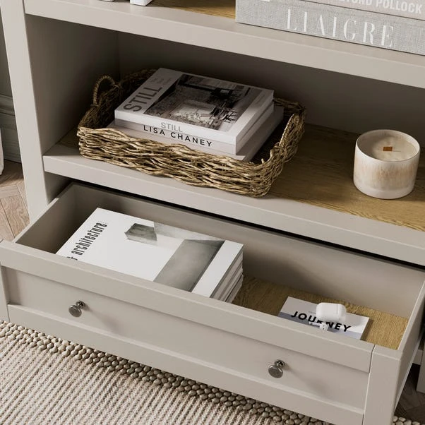Bring style and practicality to your space with the Olney Low Bookcase. Perfect for storing books and displaying other items, this bookcase also features a drawer for handy out of sight storage. Finished in a stone colourway with wood effect shelves and top, this is a lovely piece for modern or traditional interior design styles.
