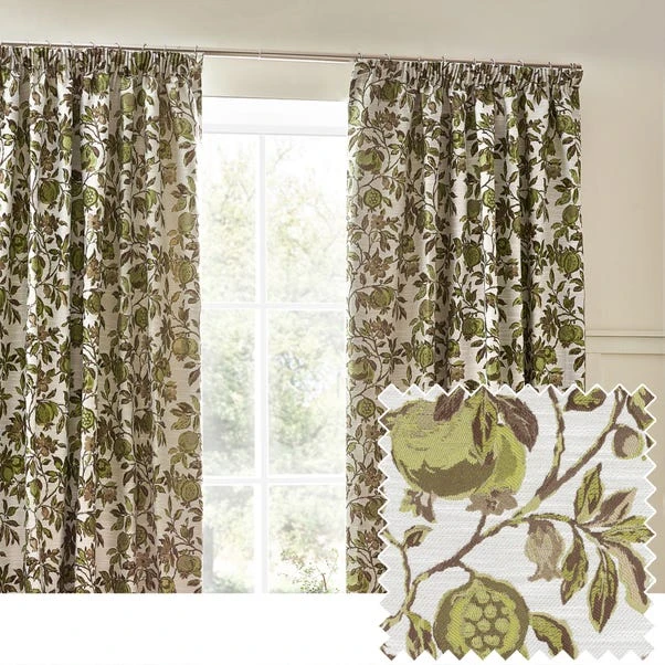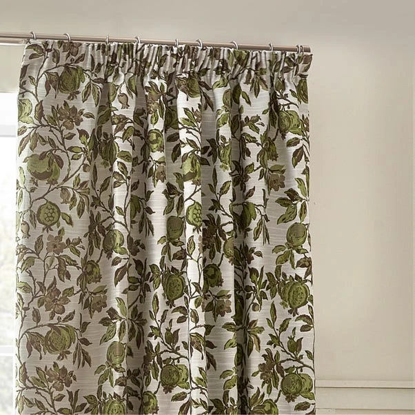 The Pomegranate Green curtains offer a timeless floral jacquard pattern, available in natural, earthy tones. Finished with a pencil pleat header and matching tiebacks, these panels bring elegance to your space. The 100% polyester fabric is soft, durable, and features room-darkening properties for added privacy and warmth.
