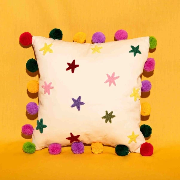 Illuminate your home with a magic touch using our Raspberry Blossom Tufted Stars Cushion with Pom Poms. The decorative tufted Star design adds a touch of wonder to any room. Adorned with pompom trimmed edges, this cushion radiates charm. Crafted with a 100% Cotton outer, it offers a luxurious finish that’s as soft as it is stylish.