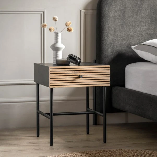 Designed to complement modern interiors, this bedside piece offers both elegance and practicality. Its sleek carcase boasts a black finish with a pressed woodgrain effect, creating a luxurious look and feel. The drawer fascia features real oak woodgrain veneer adorned with a striking black line pattern, adding a touch of sophistication to the design. Complete with a black metal underframe and drawer handle, this bedside exudes modern flair.