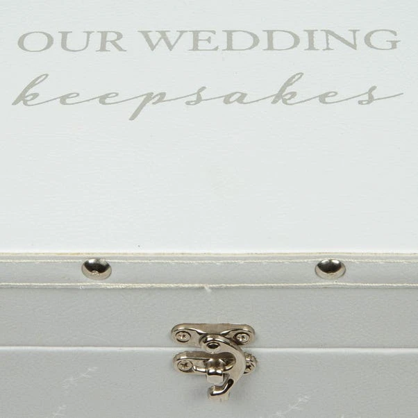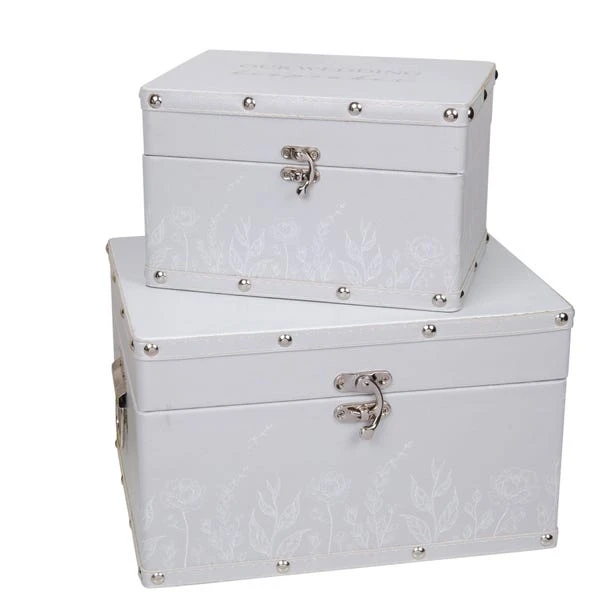 Safeguard your cherished wedding memories in these stylish leatherette storage trunks, adorned with delicate floral designs and a silver “Our Wedding Keepsakes” decal. The silver metal clasp and studded edge trim add a timeless, elegant finish. The set of two includes both large and small boxes, providing ample space for photos, cards, and other precious keepsakes from your big day.