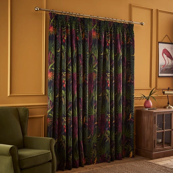 Brighten up your home with the beautiful Tropical Treasures curtain range. Inspired by artwork held in the Natural History Museum archives, these curtains sport a striking maximalist print, featuring tropical birds among exotic foliage. Fully lined for extra support, these curtains are crafted from 100% recycled polyester with a rich velour finish for an added touch of luxury. Available in a range of widths and drops, you can create a cohesive look within your home.