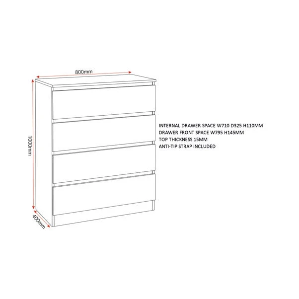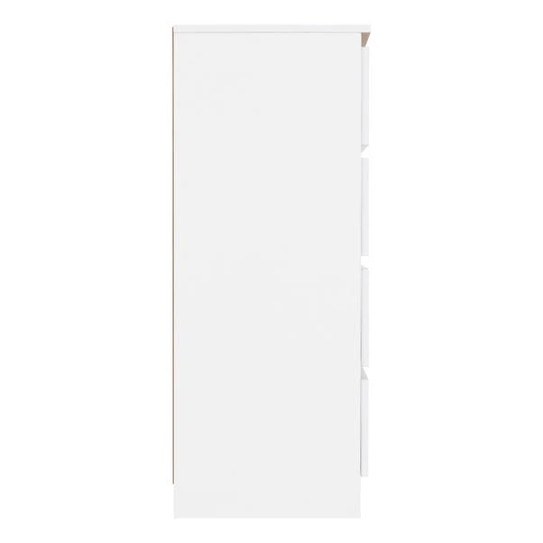 Featuring four spacious drawers, this chest provides ample space to neatly organise clothing, accessories, and personal items. Crafted from durable materials, this chest ensures longevity and reliability in everyday use. Its clean lines and choice of multiple wooden finishes, including classic oak and contemporary grey, allow it to effortlessly complement various bedroom aesthetics. The sleek design is accentuated by discreet handles, adding a touch of sophistication to your bedroom decor.
