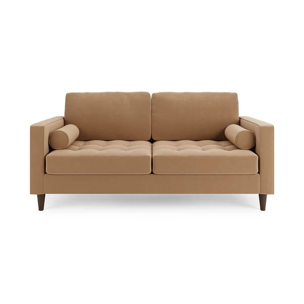 Introduce a stylish, retro-inspired look to your living or spare room with the gorgeous Zoe Velvet 3 Seater Sofa Bed. This sofa features soft and hard-wearing velvet fabric upholstery, styled with a gorgeous tufted seat cushion, piped edge detailing and stylish tapered solid wood legs. As stylish as it is comfortable, the Zoe is the perfect place to sit back and unwind, featuring a foam filled, spring seat, as well as two matching bolster cushions to boot. This sofa easily converts into a comfortable double bed for those impromptu overnight stays.